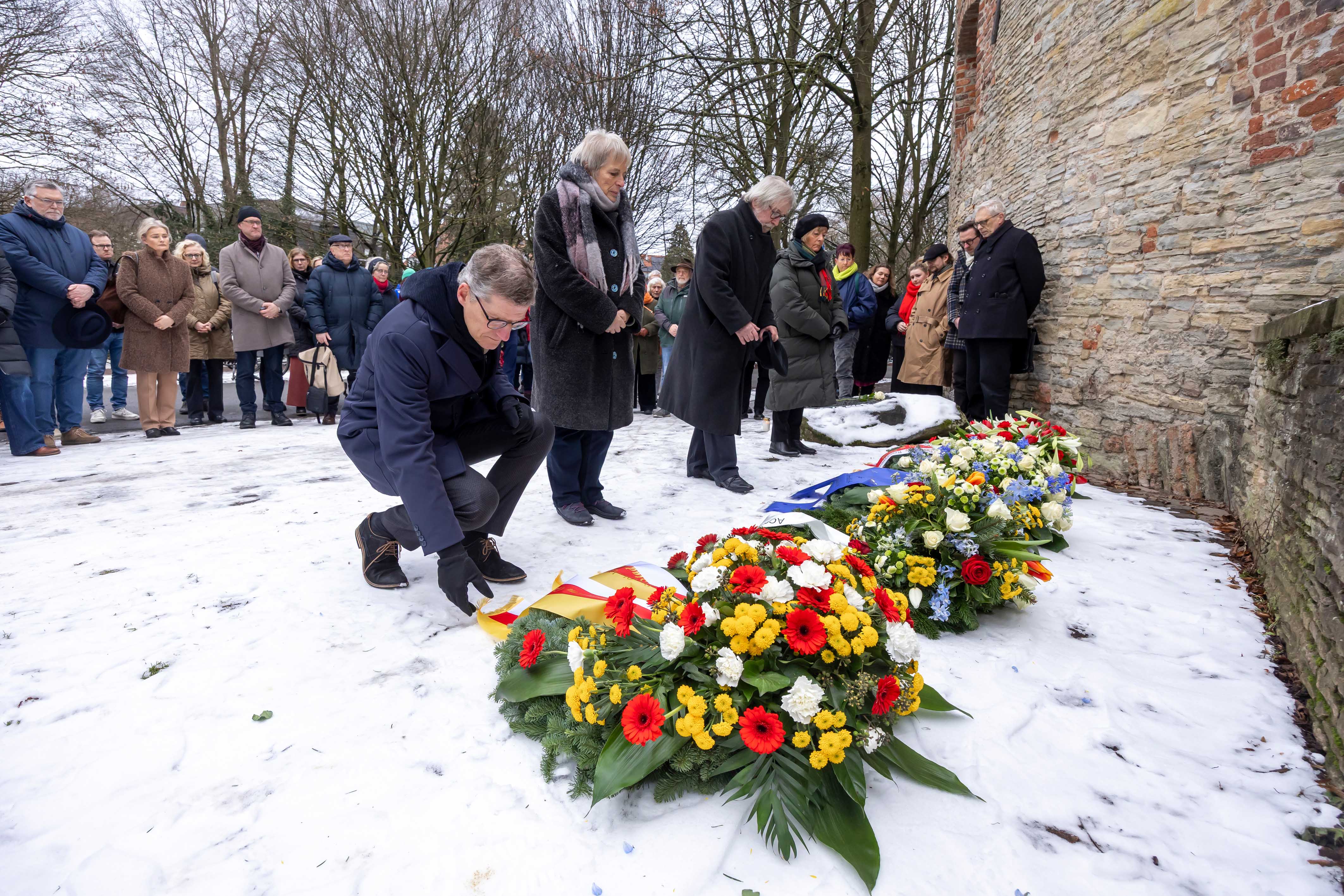 Am Nachmittag legten Vertreterinnen und Vertreter der Gesellschaft für Christlich-Jüdische Zusammenarbeit, der Arbeitsgemeinschaft Christlicher Kirchen und Oberbürgermeister Fuchs einen Kranz am Zwinger an der Promenade nieder. Im Anschluss folgte ein ökumenischer Gottesdienst in der St.-Lamberti-Kirche.