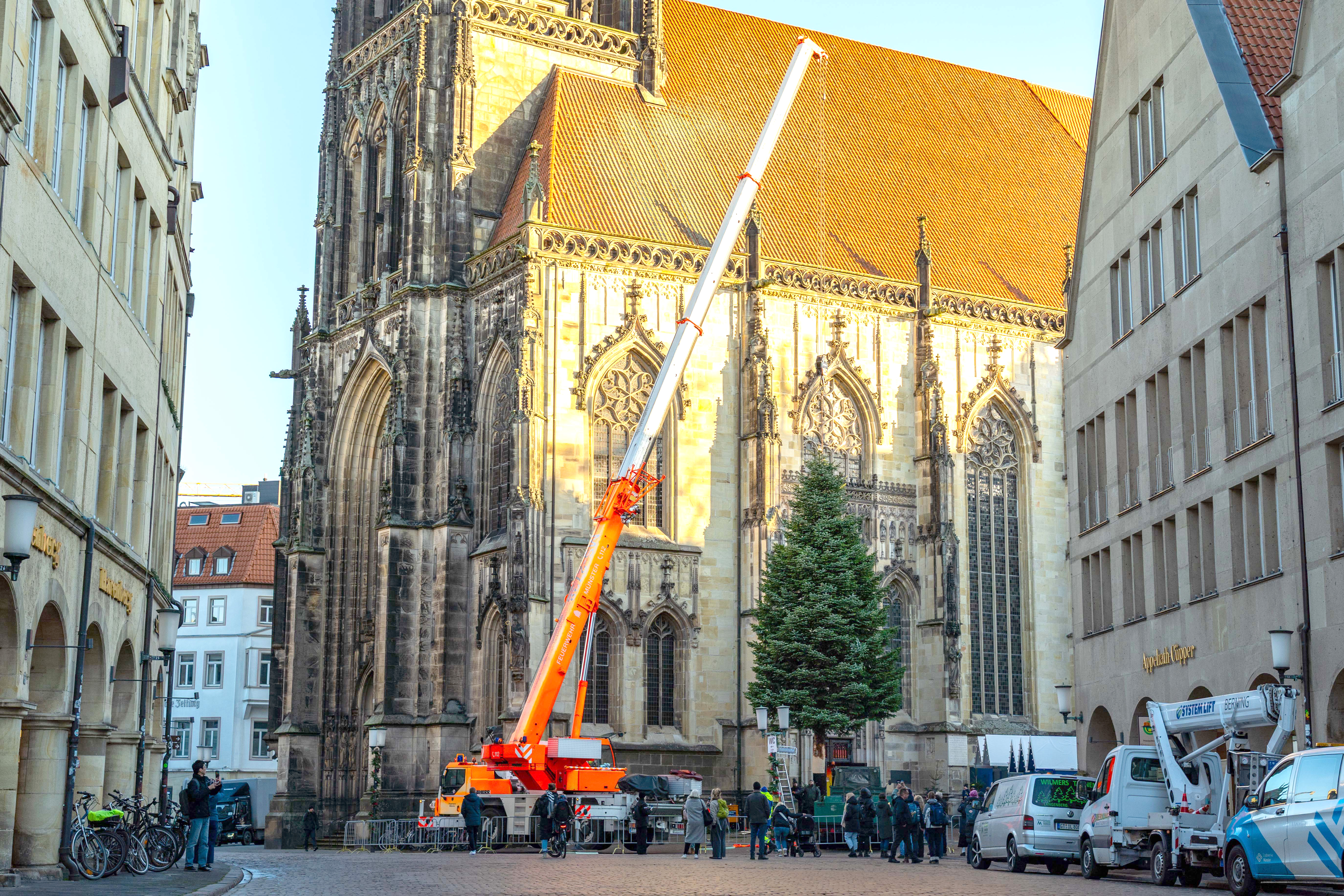 Baumscout Hubertus Wilmers hat sie ausgewählt und per Tieflader in die Innenstadt gebracht. Münster Marketing organisiert und finanziert den Aufbau gemeinsam mit den Kaufleuten des Prinzipalmarkts.