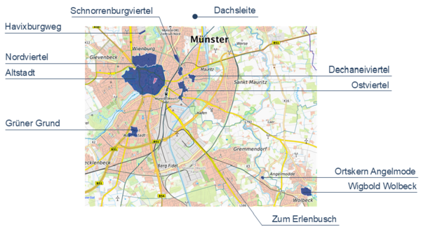 Ein Antrag auf Genehmigung nach §172 des Baugesetzbuches wird im Geltungsbereich der auf den Lageplan dargestellten Satzungsgebieten erforderlich – oder soweit ein Bebauungsplan in Teilbereichen eine entsprechende Festsetzung enthält.