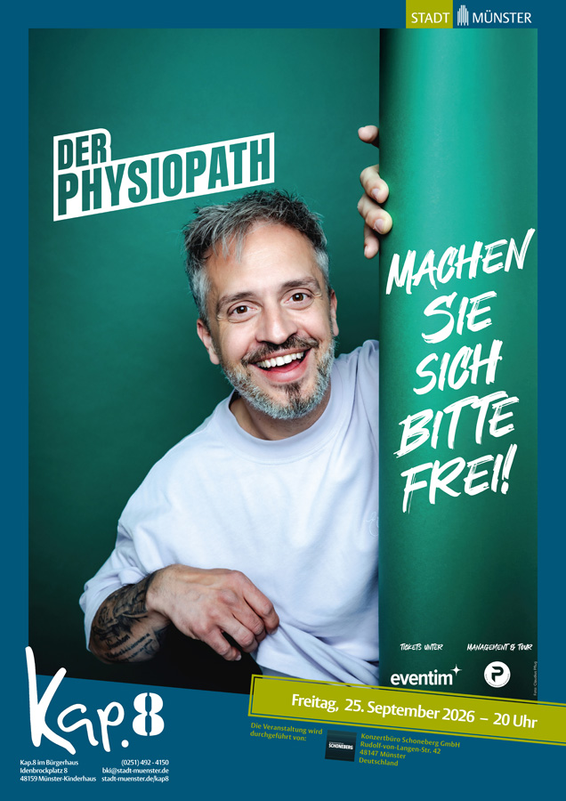 Ein unterhaltsamer und humorvoller Abend mit Tipps, Tricks und Tools, die jeder zuhause nachmachen kann. Dazu eine geballte Ladung Infotainment und Wissen, die Dir helfen, Dein Leben selbst in neue und gesündere Bahnen zu lenken. Sei bereit für eine Show voller Entertainment, Faszination für den Körper und ganz viel Spaß! An diesem Abend wirst Du Dich gesundlachen! Eines versprechen wir: Du gehst gesünder nach Hause, als Du gekommen bist! Der Physiopath (Frederic Newnham) ist einer der bekanntesten und erfolgreichsten Medizin-Kanäle auf TikTok und Instagram - auf YouTube kannst Du ihn auch sehen. Er ist Physiotherapeut, Dipl. Osteopath und Mentalcoach!