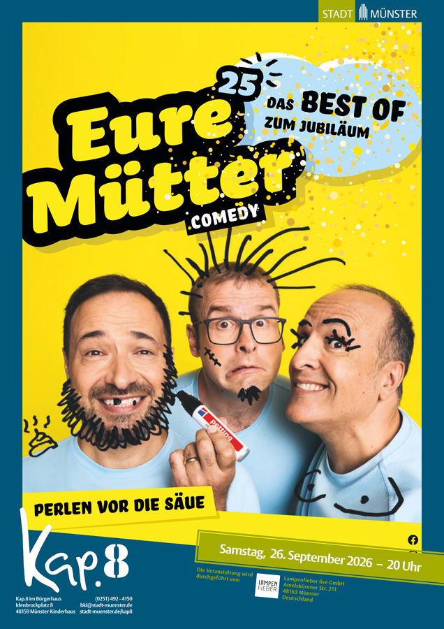 Schon immer steht ihre langjährige Freundschaft als unsichtbare Superkraft hinter jeder Pointe. Nach mehreren tausend Auftritten im In- und Ausland vor vielen zigtausend Zuschauern und über 70 Millionen Klicks auf YouTube stopfen sie die absoluten Highlights ihres bisherigen Schaffens nun in dieses BEST OF. Das Ergebnis ist eine zweistündige Jubiläumssause mit „Ich schmeiß mich weg!“-Garantie von der ersten bis zur letzten Sekunde – abgesehen von einer kleinen Erholungspause in der zweiten Hälfte, in der Don ein paar Minuten lang einfach nur seine Narben zeigt. Der Weg durch ein Vierteljahrhundert Mütterbespaßungswerk führt die Zuschauer an aufregende Orte: auf den Mittelaltermarkt, ins Büro der GEMA, vors Damenklo und auf das Schiff von Käpt’n Laminiergerät. Dabei wird das Publikum stets sicher geführt von dem Comedy-Act, der mehr Wert auf Körperpflege legt als jeder andere – hier ist garantiert der Sack frisch rasiert und das Haupthaar weltmeisterlich gewaschen. Wer EURE MÜTTER bereits live erlebt hat, kann es sowieso kaum erwarten, diesem generationenübergreifenden Spektakel auch dieses Mal wieder beizuwohnen. Und wer die drei bisher nur aus dem Internet kennt, hat nun die Chance, sie lebendig und in Farbe zu genießen, und zwar mit den heißesten Nummern, die sie je geschrieben haben – sowie ein paar Überraschungen…