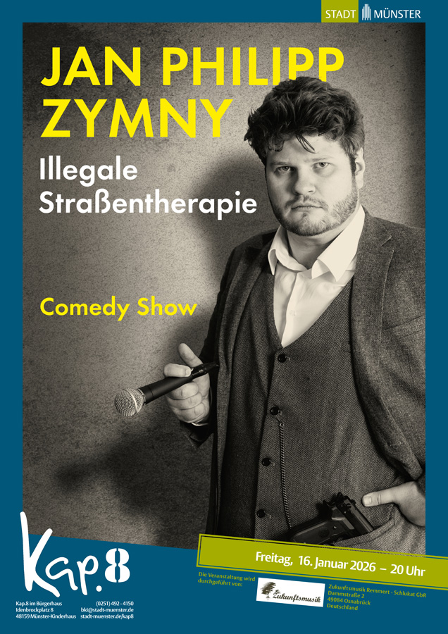 Der Bochumer Humor-Künstler geht ab Herbst 2025 auf Tour durch den gesamten deutschsprachigen Raum. Nach dem Erfolg von „Quantenheilung durch Stand Up Comedy“ bringt er sein nächstes Programm mit 100% neuem Material auf die Bühne. „Illegale Straßentherapie“ ist für alle, die sich nicht scheuen, das Leben auf die Schippe zu nehmen und Pause von der Realität zu machen. Mit seiner unnachahmlichen Mischung aus treffendem Witz und tiefgründiger Ironie präsentiert Zymny einen Abend, der nicht nur unterhält, sondern auch den Verstand herausfordert. Erleben Sie, wie er mit seinem feinen Gespür für das Absurde die Realität zerpflückt und dabei steht nicht nur „Mental Health“ im Mittelpunkt. Stattdessen entführt Zymny sein Publikum in die verrückte Welt des Alltags – mal scharfsinnig, mal absurd, aber immer voller unvorhersehbarer Wendungen. Er spielt mit den vielen Facetten des Humors und liefert eine Comedy-Show, die genauso viel Intellekt wie Überraschung bietet.