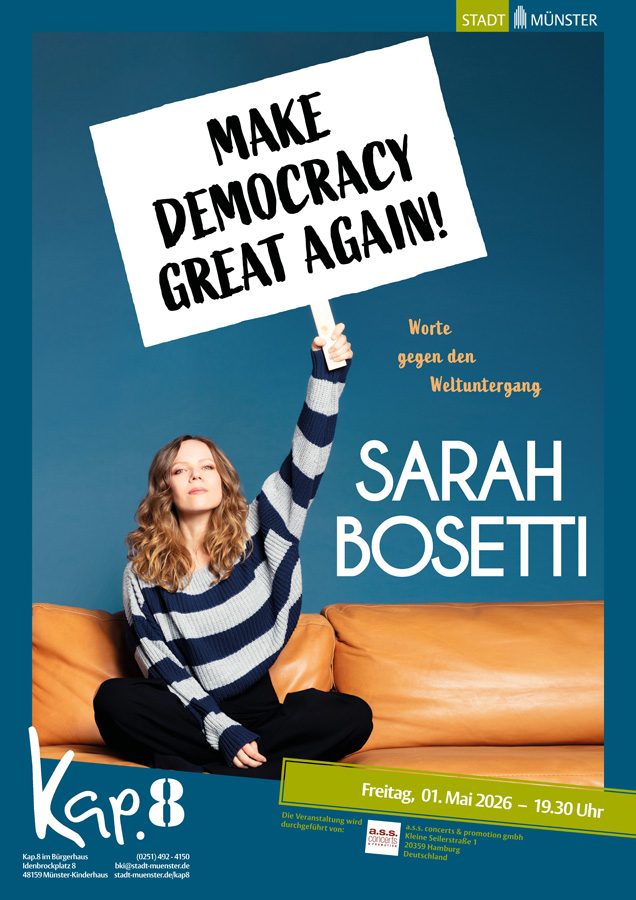Sarah Bosetti ist Satirikerin, Autorin, Lyrikerin und Feministin wider Willen. Sie wurde bereitsu.a. mit dem Grimmepreis, dem Deutschen Fernsehpreis, dem Deutschen Kleinkunstpreis, dem Joachim-Ringelnatz-Preis für Lyrik und dem Dieter-Hildebrandt-Preis ausgezeichnet. Sie schreibt und moderiert die monatliche Late Night Show «Bosetti Late Night» (3sat), das wöchentliche Satireformat «Bosetti will reden!» (ZDF) sowie den extra3-Podcast «BosettisWoche» (NDR) und ist regelmäßig auf Live-Tour im gesamten deutschsprachigen Raum.