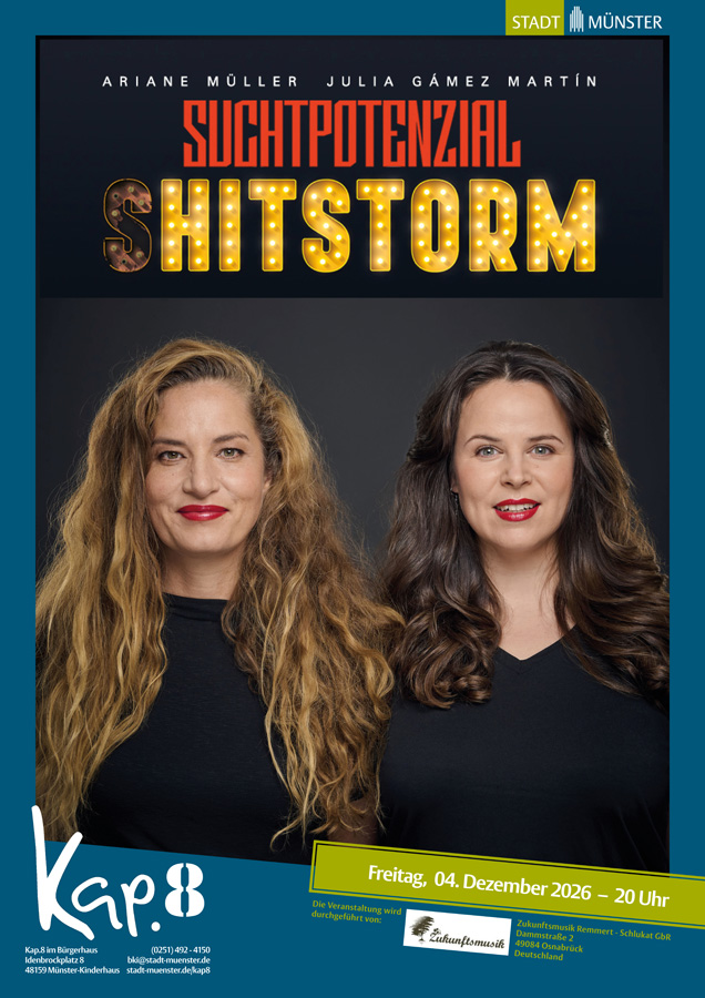 Mit den legendär albernen Dialogen von Julia und Ariane wird das ruhmreiche und grandiose Werk dramaturgisch neu eingeordnet ins Weltgeschehen. Suchtpotenzial sind mal albern, mal aggro, aber immer ehrlich und laut. Wer kritische Lieder singt, weiß oft nicht, ob es Morddrohungen oder Kabarettpreise hagelt. Die Suchtis mussten auf die harte Tour lernen, dass sie sich auf einem schmalen Grat zwischen Hit- und Shitstorm bewegen. Hit me Suchti one more time!