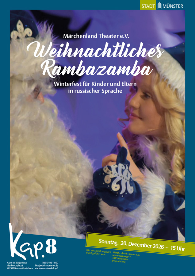 Und plötzlich befinden wir uns mitten in zauberhaften Verwandlungen… Ein Märchen und ein Geheimnis, glitzernder Schnee im Winterwald, leuchtende Sterne am Winterhimmel und außergewöhnliche lustige Abenteuer. All das erwartet die Zuschauer auf der Bühne. Kinder, ihre Eltern und die Schauspieler vom Märchenland Theater e. V. werden Teil einer lustigen und märchenhaften Show „Weihnachtliches Rambazamba“.