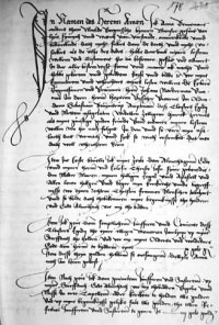 Das Stadtarchiv bewahrt eine große Zahl von Testamenten vor allem aus dem 16. und 17. Jahrhundert auf. In dieser Zeit hatte der Rat auch gerichtliche Aufgaben, so daß Bürgerinnen und Bürger ihre Testamente, wenn sie sie nicht in der Familie lassen wollten, dem Rat zur Ausführungskontrolle übergeben konnten. Diese dem Rat übergebenen Testamente heißen öffentliche Testamente. Leider sind private Testamente im Stadtarchiv nicht überliefert. So ist nicht einmal ihre Zahl bekannt. Das Testament von Anna Bennemans gehört noch einer Epoche an, in der Testatorinnen und Testatoren mehr für religiöse als für soziale Zwecke stifteten. Aber wenig später, um 1570, kehrte sich das Verhältnis um. Seitdem wurde mehr für soziale als für religiöse Zwecke gestiftet. |