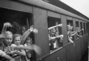 "In Münster rüsten sich die Ortsgruppen der N.S.D.A.P. zur Kinderlandverschickung. Dies ist ein Waggon mit Kindern, die auf der Fahrt nach Bayern begriffen sind."