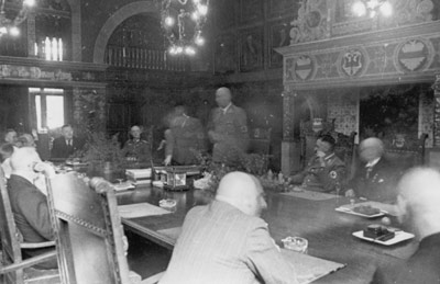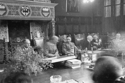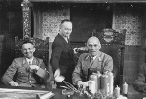 "Das Bild zeigt den Oberbürgermeister in fröhlicher Stimmung mit dem Gauleiter am Geburtstag des Oberbürgermeisters in der Ratsherrensitzung im Sitzungssaal des Stadthauses (November 1940)."