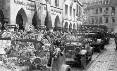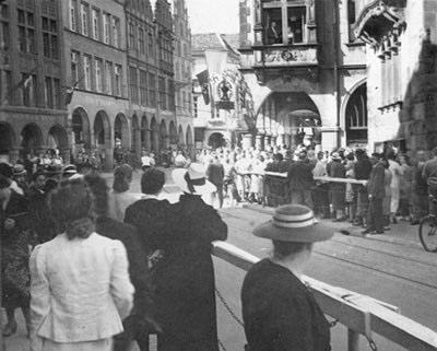 "Langsam fährt der Propaganda-Wagen der Gau-Filmstelle von Straße zu Straße. Sobald das Frankreichlied verklungen ist, spricht die dröhnende Stimme des Wagens in die aufmerksam lauschende und freudige Menge: Achtung! Achtung! Heute 17 Uhr kommen unsere siegreich heimkehrenden Truppen durch Münster und berühren folgende Straßen: Roxelerstraße, Frauenstraße, Spiekerhof, Roggenmarkt, Salzstraße, Adolf-Hitler-Straße, Schorlemerstraße, Ludgeristraße. Am Rathaus wird der Vorbeimarsch sein.