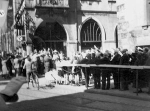 "Vor dem Rathaus stehen der Gauleiter, der Regimentskommandeur und der Oberbürgermeister und viele andere führende Männer der Partei und der Stadt."