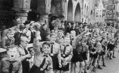 Jubelnde Hitlerjungen bei der Militärparade auf dem Prinzipalmarkt vor dem Rathaus am 18. Juli 1940