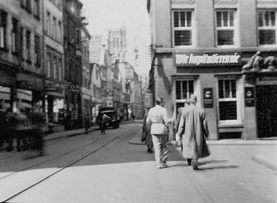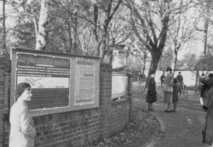 "Überall in der Stadt wird jede Woche die neue 'Parole der Woche' herausgegeben vom Reichspropagandaministerium, an den Anschlagtafeln in der Stadt angeschlagen. Diese Anschlageblätter haben stimmungsmäßig eine große Wirkung und üben auf Jung und Alt täglich Anziehungskraft aus. Hier sehen wir die neue 'Parole der Woche' am 2. Nov. 1940 an der Ecke von Himmelreichallee und Droste-Hülshoff-Allee angeschlagen."