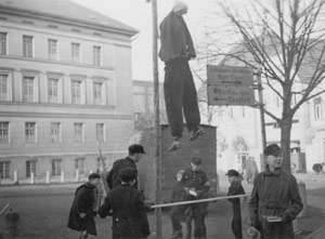 "Am Aegidiikasernenplatz sammeln sie unter dem Galgen, an dem sie eine Puppe aufgehängt haben, die den General 'Winter' als den Verbündeten der Alliierten darstellen soll." Text des Plakats: "Mit dem feindlichen General Hunger haben wir kurzen Prozeß gemacht. Den General Zwietracht haben wir auch erschlagen und hier haben wir den General Winter aufgehängt."