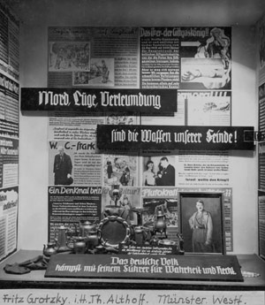 Die Dekoration der Firma Th. Althoff enthält ein Bildnis Hitlers, Metallgeschirr, Propagandaschriften, Textleisten "Mord, Lüge, Verleumdung sind die Waffen unserer Feinde!" und "Das deutsche Volk kämpft mit seinem Führer für Wahrheit und Recht."