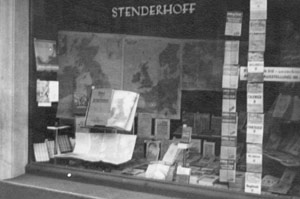 "Die Landkarten von England beherrschen die Schaufenster der Buchhandlungen seit Beginn des Juni 1940. Das Fenster der Buchhandlung Stenderhoff auf der Salzstraße."