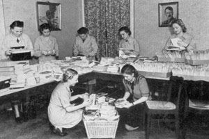 "Diese vielen Bücher hat die Stadtsparkasse vor Weihnachten 1939 zusammengekauft und mit den Feldpostpäckchen den im Felde stehenden Münsteranern eine große Freude bereitet. Noch größer aber sei die Freude an den sieben hübschen Mädels gewesen, die jedes der Bücher ins Feld begleitet haben, wenigstens in diesem Bilde."