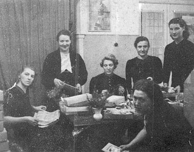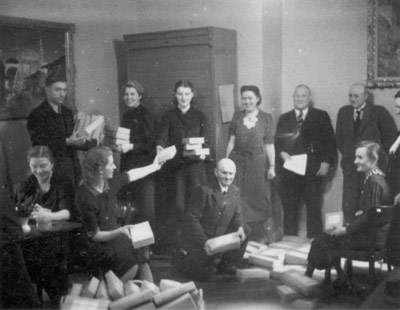 "Der ganze Stab des Parteigenossen Markus von der Stadtverwaltung, der ihm beim Packen der Feldpostpäckchen behilflich ist."