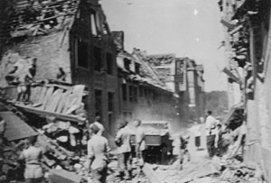 Blick in eine Straße mit völlig zerstörten Häusern. Auf der Straße liegen Schutt und Trümmer. Arbeiter sind mit einem Lastwagen mit der Trümmerbeseitigung beschäftigt