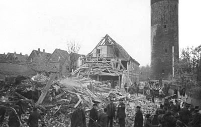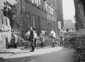 "Schneller Einsatz und fleißige Arbeit der R.A.D. Männer bei der Beseitigung des zerstörten Hauses in der Pferdegasse um die Mittagsstunde des 8.7.41."