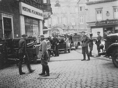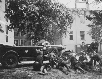 "Löschzug der S.H.D. [Sicherheits- und Hilfsdienst] beim Einsatz gegen den Brand in der Telgterstraße u. Winkelstraße."