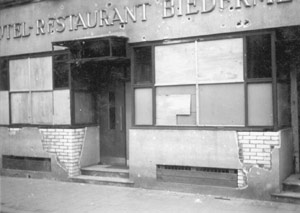 "Der Gasthof Biedermeier am Marienplatz ist notdürftig wieder hergestellt und hat seinen Betrieb schon wieder aufgenommen. Die großen Bombenlöcher sind mit Kalksteinen zugemauert."