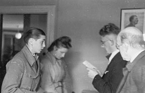 "Erinnerungen an die Augusttage 1941 Im Dienstzimmer 317, Anmeldung der Schäden der von Bombenschäden betroffenen Münsteraner. Wenn einer abgefertigt ist, stehen gleich zwei neue Bombengeschädigte hinter ihnen."