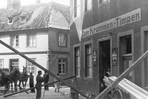 "Langsam geht es mit den Aufräumungsarbeiten weiter. Im Gasthof "Zum Krummen-Timpen" beginnt man hinter den Pappdeckelfenstern schon wieder mit den Erneuerungsarbeiten."