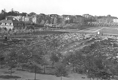 "Blick über den Neuplatz mit den Schuttbergen vom Fenster des Gerichtsgebäudes."