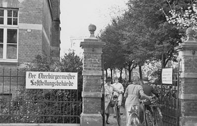 "Das Aus u. Ein der Geschädigten in der Schädenfeststellungsbehörde auf der Neustrasse, die auch heute noch täglich zu Hunderten hier vorsprechen."