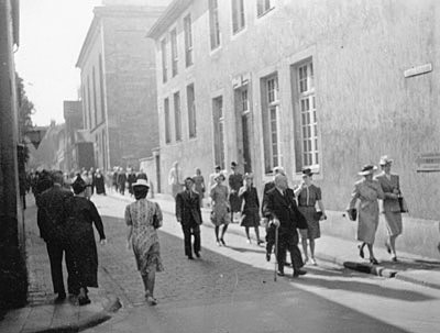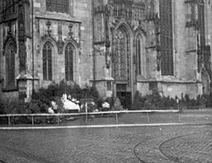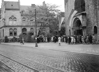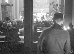 "Ein Blick am Ostermorgen gegen 10 Uhr in die Aegidiikirche, von der Ecke aus, wo eine Gruppe von Soldaten steht. Im Vordergrund der Kirche entsprechend der Kriegszeit nur Frauen."