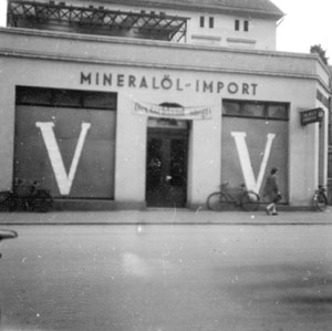 "Das europäische Siegeszeichen V, das Viktoria bedeutet, hat auch in der Propaganda in Münster Eingang gefunden, besonders vor zugenagelten oder mit Pappkarton geschlossenen Schaukästen. Hier ist das Siegeszeichen von der Firma Nolte von der Horst-Wessel-Strasse angebracht."