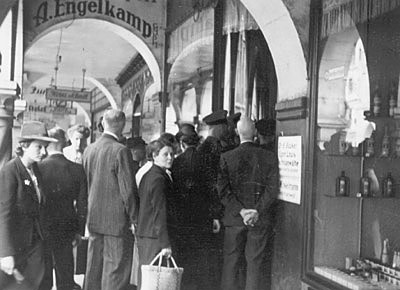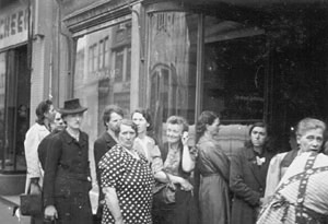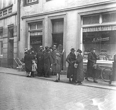 "Einzelne Geschäfte, darunter auch das Möbelgeschäft auf dem Alten Steinweg haben in ihren Schaukästen Plakate ausgehängt auf denen sie als Verkaufsstelle für Totalbeschädigte bezeichnet sind. Andere brauchen gegenwärtig gar nicht versuchen, dort Einkäufe zu tätigen. Auch keine Brautleute, die ihre Möbel einkaufen möchten."