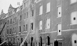"Haus Aegidiistraße Nr. 59, Juli 1942: In dieser Nacht gibt es zwischen den Höfen der Aegidiistraße nachts 4 Uhr einen furchtbaren Krach. Man meinte eine Bombe hätte eingeschlagen. In der Frühe sieht man, daß der infolge des Krieges schlechte Zustand der alten Häuser und die Unmöglichkeit Reparaturen zu machen dazu geführt hat, daß aus dem Haus Nr. 59 ein Mauerstück herausgestürzt ist und das darunterliegende Dach zerschlagen hat."