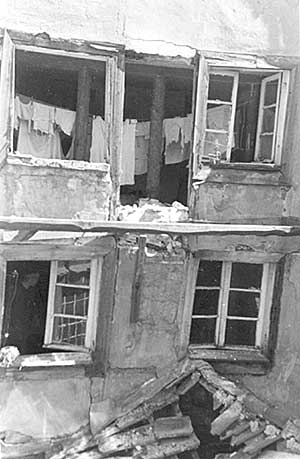 Beschädigte Gebäude in der Lingener Straße, deren Fenster mit Pappe verschlossen sind.