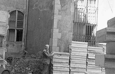Vor dem Gewölbekeller des Stadthauses stehen 200 Holzkisten, in denen Akten des Stadtarchivs verpackt werden sollen. Die Bestände des Stadtarchivs wurden 1942 nach Schloss Wöbbel evakuiert.