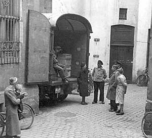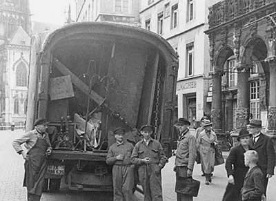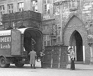 "Auf diesen Bildern sieht man die Arbeiter, wie sie Stücke der Wandbekleidung des Friedenssaales aus der Zeit von 1570 in den Möbelwagen bringen."