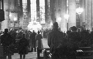 Es herrschte Mangel an Metall für die Waffenproduktion. Zahlreiche Kirchenglocken wurden daher eingeschmolzen. Passanten beobachten das Herunterlassen der Glocken an der Ludgerikirche.