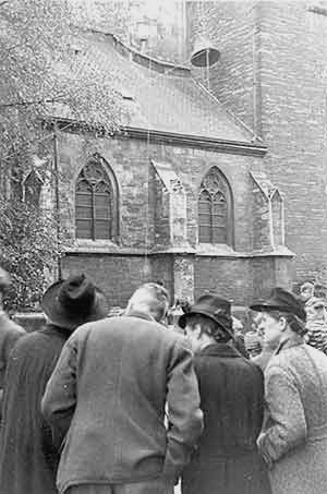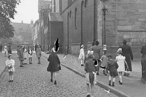 "Frühmorgens am 17. Mai 1942. Sichtlicher Eifer besteht unter den kleinen Mädchen, die um 8 Uhr in ihren neuen Kleidern sich vor der Kirche sammeln. In geschlossenem Zuge werden die Kinder zur Kirche abgeholt."