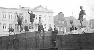 "Immer neue Lastkraftwagen mit Kalksteinen für neue Luftschutzkeller werden in die Stadt gefahren. - Ein Transport von 3 Wagen auf dem Ägidiikasernenplatz auf dem münstersche Jungen sich Postamente bauen."