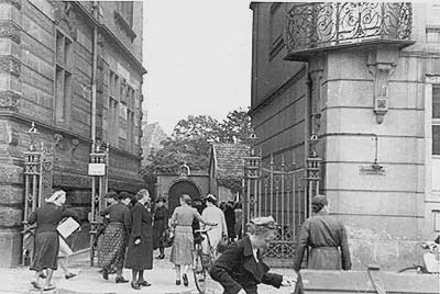 Frauen, die während des Fliegeralarms auf dem Wochenmarkt gewesen sind, gehen in den Luftschutzkeller des Regierungsgebäudes.