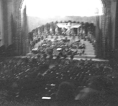 "Der Gauleiter redet in der Stadthalle. Eine kleine Aufnahme, leider verwackelt, welche zeigt, wie die Stadthalle bis auf die Tribünen hinauf besetzt war, als der Gauleiter in der Stadthalle seine Rede hielt."