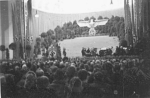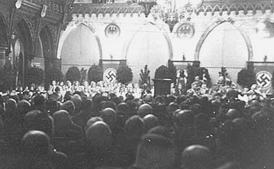 "Lebendiges Leben aber ist in allen Häusern der Stadt, wenn die Strassen auch sehr still werden. Das zeigt die heutige Feierstunde der Kreisleitung im Rathaussaal unter dem Leitwort: Familie, Sippe und Volk. Bis auf den letzten Platz ist der Saal bei solchen heimat- und lebensnahen Themen besetzt."