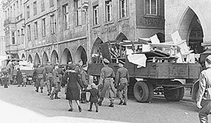 Wehrmachtssoldaten beladen Lastwagen mit Tischen und Stühlen, die im Prinzipalmarkt vor den Geschäften Kluxen und A. Spanke stehen.