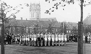 "So groß ist der Kreis der Münsteraner, die an den Sportveranstaltungen auf dem Domplatz heute teilgenommen haben. Auf vielen andern Plätzen sind ähnlich gut besuchte Veranstaltungen für das W.H.W."