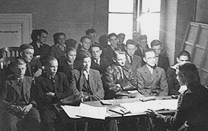 "Musterung im August 1942. In diesem Monat finden wieder umfangreiche Musterungen und Einziehungen junger Leute statt. Eine Gruppe junger Rekruten wird hier nach der Musterung in dem Treppenraum des Stadtweinhauses über die Pflichten eines Rekruten unterrichtet."