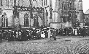 Verlassene Verkaufsstände auf dem Domplatz während eines Fliegeralarms