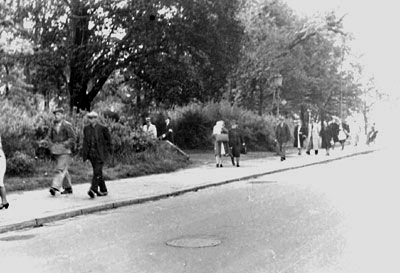 Blick auf eine große Gruppe von Menschen, die die Splittergräben an der Promenade nach der Entwarnung vom Bombenalarm verlassen und zurück in die Stadt gehen. "Sobald die Entwarnung kommt, leeren sich die Splittergräben und die Luftschutzkeller mit großer Beschleunigung, und alle Straßen bieten dann wie immer ein Bild lebhaftesten Verkehrs."