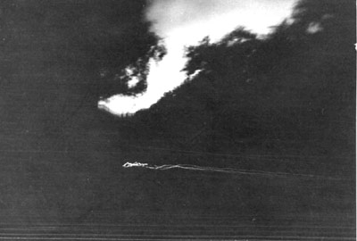 "Bomben auf Münster in der Nacht vom 12. zum 13. Juni 1943. Fotos aus der Frühe zwischen 5 u. 6 Uhr. Der Kamerad von gestern Abend hat Recht behalten. Diese Nacht sind wieder Bomben auf Münster gekommen. Der Blick aus der dunklen Aegidiipromenade zeigt in Richtung Hafen einen rotglühenden Nachthimmel."