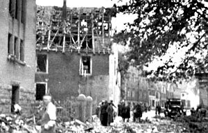 Johannisstraße nach dem Bombenangriff am 10. Oktober 1943, im Hintergrund sind der Turm des Domes und der Petrikirche zu erkennen.