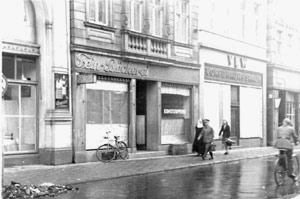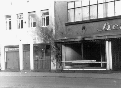 Die Metzgerei Heinrich Raape [Ludgeristraße 76] und das Bekleidungsgeschäft Hettlage [77/78] an deren Außenfassade deutlich die Spuren einer Phosphorbombe zu sehen sind.